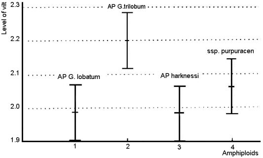 Values of wilt affection of F2 hybrids have been subjected to the analysis of variance. Middle of the vertical line represents the arithmetic mean of the points of affection, and the distance up and down is LSD Crossing with the forms AP G.harknessi and AP G.lobatum has the strongest influence on the increase of wilt resistance.