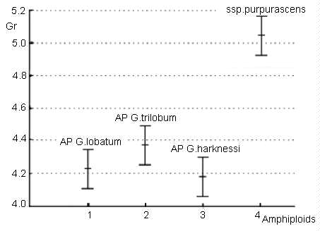 Realization of the high yield character in hybrids of AP G.trilobum (GCA effect +1.4) depends little on the choice of pair for crossing (SCA variance 1.3). Manifestation of the high yield character of ssp.purpurascens in hybrids (the highest value obtained in trials, GCA effect +5.6) depends to a great extent on the variety chosen for crossing.