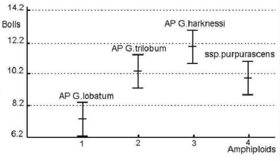 When crossed with tester varieties, the form AP G.lobatum reliably redused plant yield, if compared to other wild forms, while the form ssp.purpurascens reliably had a strong increasing effect on the character. The effect is thanks to the largest size of the boll conveyed by ssp.purpurascens to the hybrids with tester varieties.